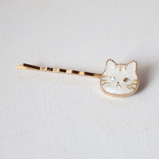 ウルウルおめめのネコヘアピン(シロさん)白猫・螺鈿風・パールホワイト