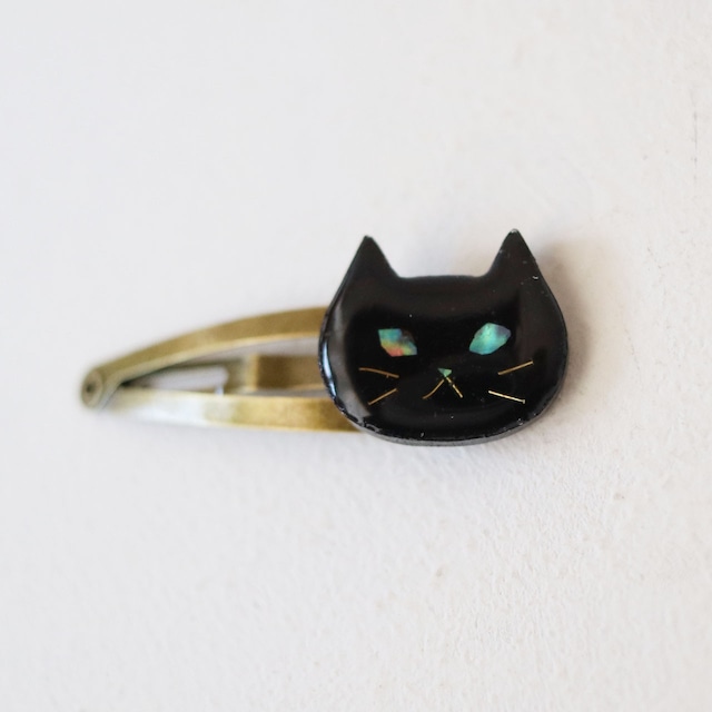 ウルウルおめめのネコヘアピン(クロさん)黒猫・螺鈿風・ブラック