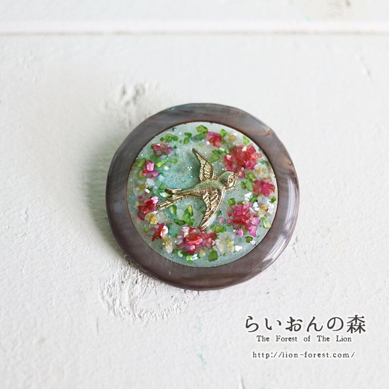 森の花畑シェルサークルブローチ(ツバメ・右向き・バラ・赤)