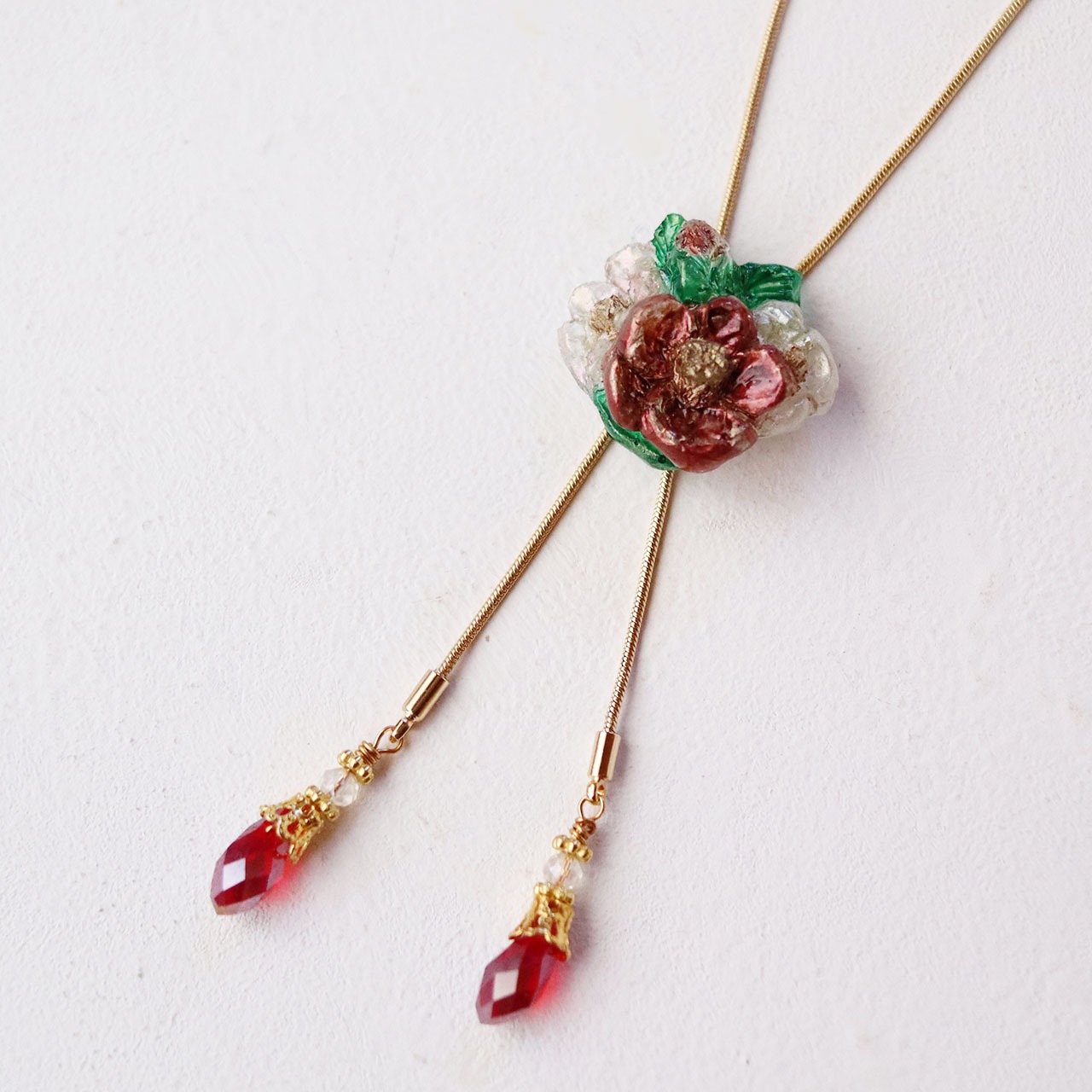 山椿のループタイ ネックレス・ラリエット風(蘇芳色)