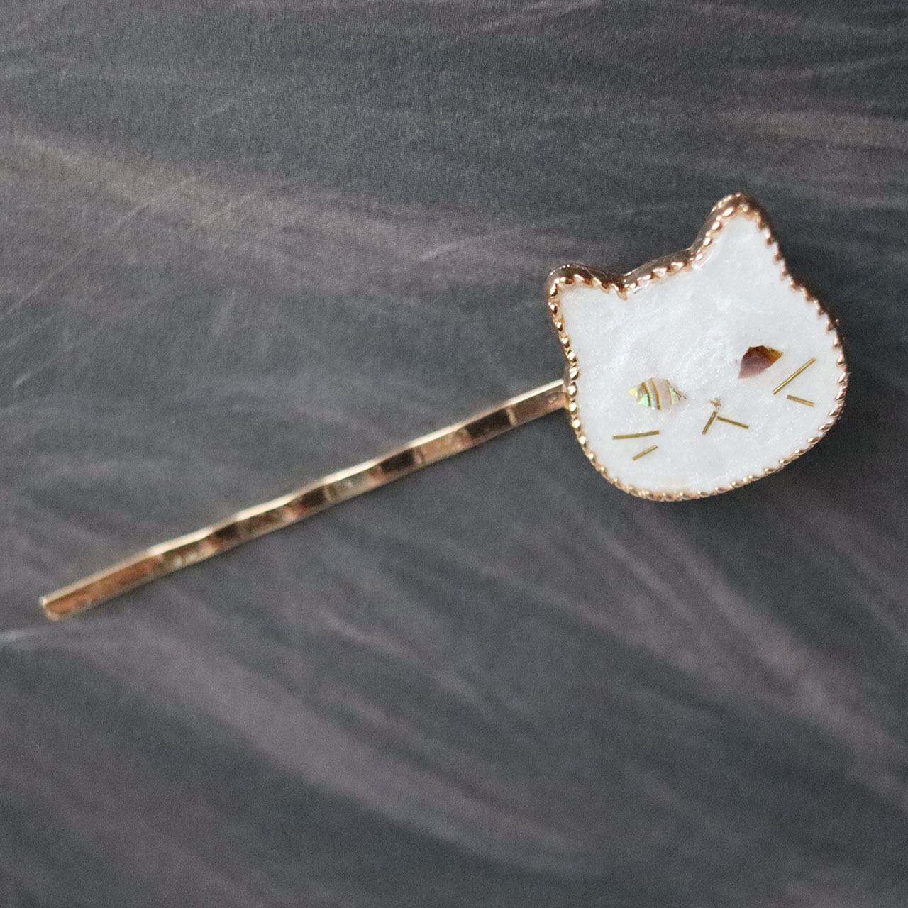 ウルウルおめめのネコヘアピン(シロさん)白猫・螺鈿風・パールホワイト