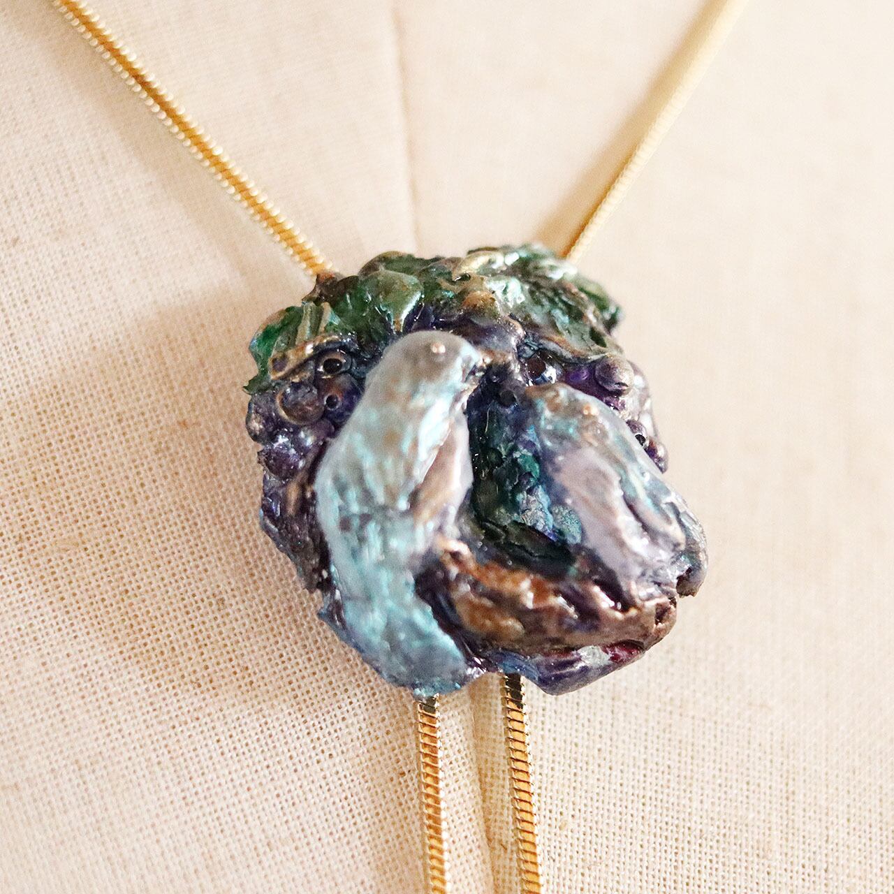 山葡萄の木陰で、仲良く寄り添っておしゃべりしている小鳥さんがモチーフのループタイです。