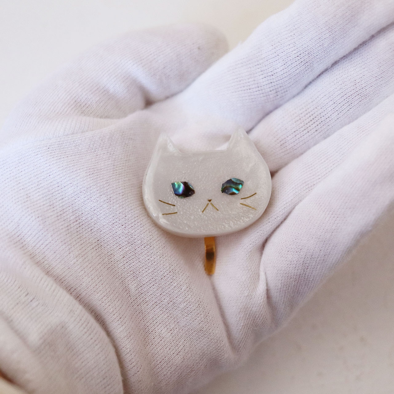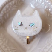 ウルウルおめめの猫ポニーフック(シロさん) 螺鈿風・パールホワイト・白猫