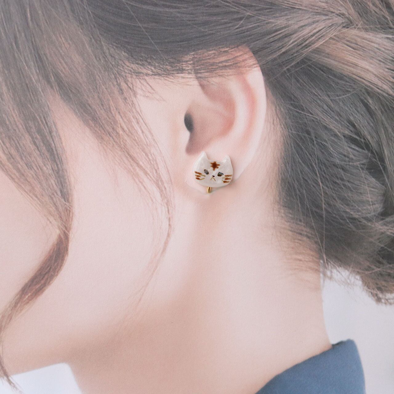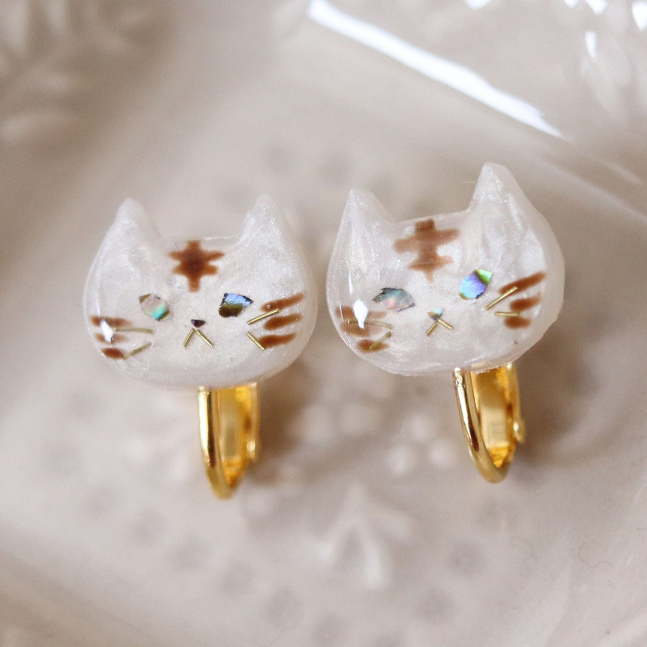 ウルウルおめめの動物イヤリング(ホワイトタイガーさん)パールホワイト×ブラウン・螺鈿風・白虎