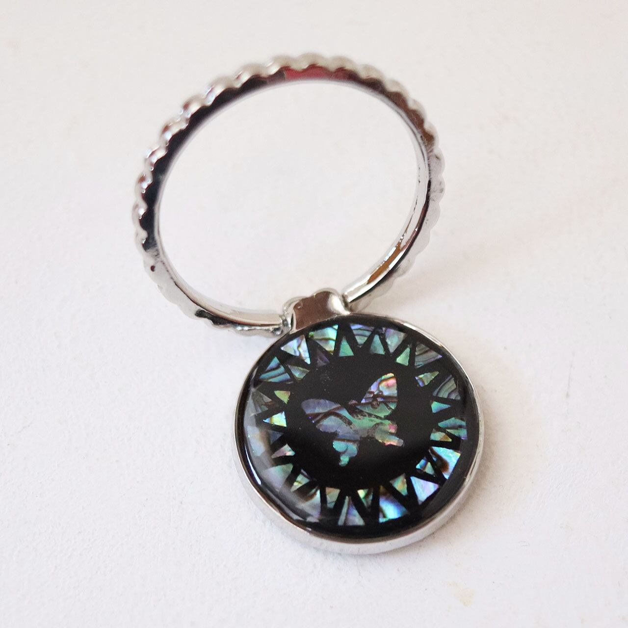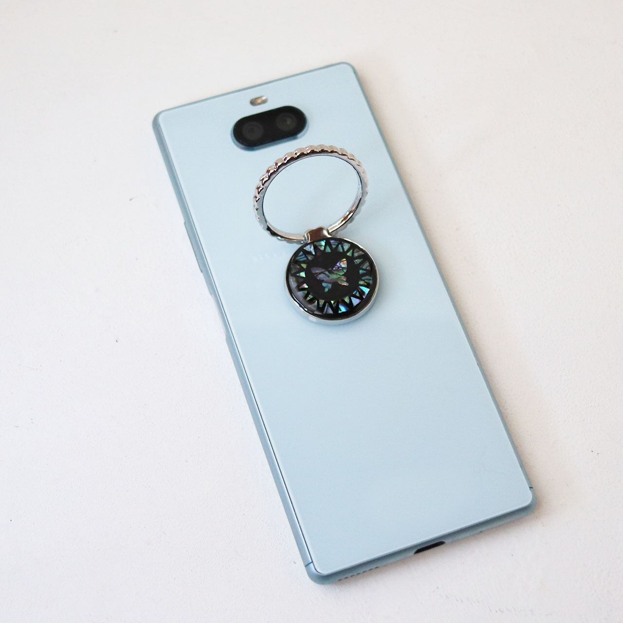 すり貝をカットし、螺鈿風に仕上げたスマホリングです。